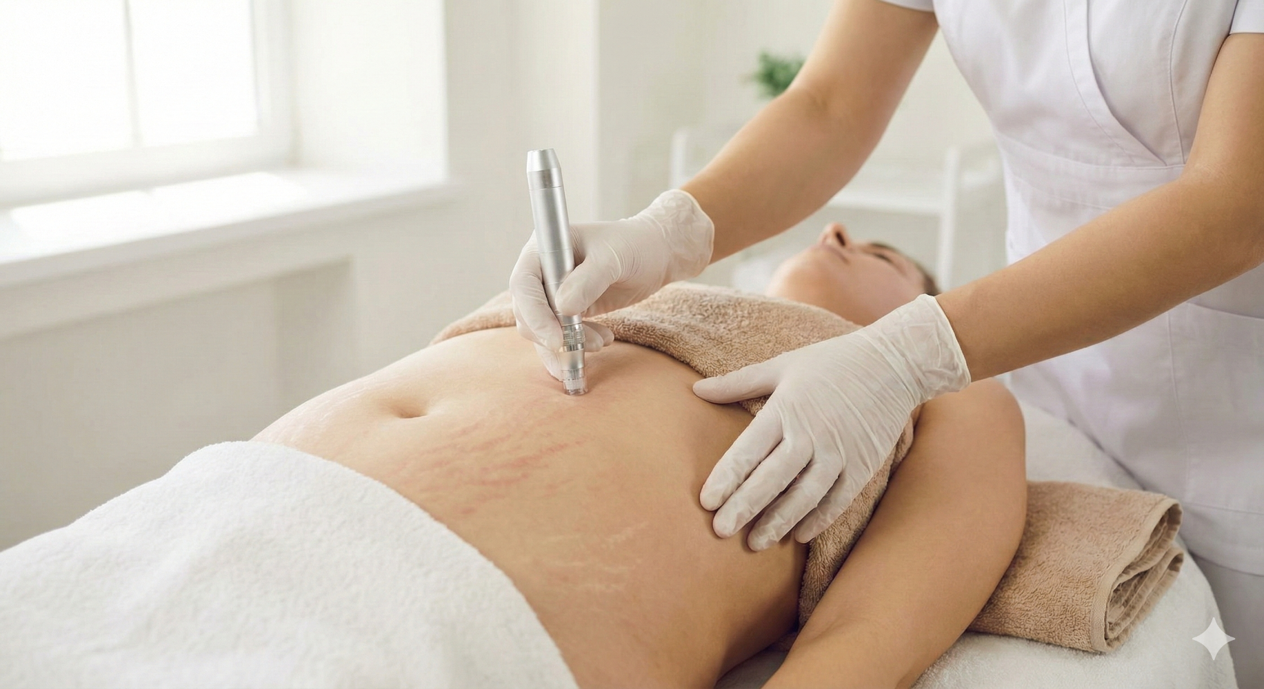 Stymulacja skóry do regeneracji, zmniejszająca widoczność świeżych i starszych rozstępów.